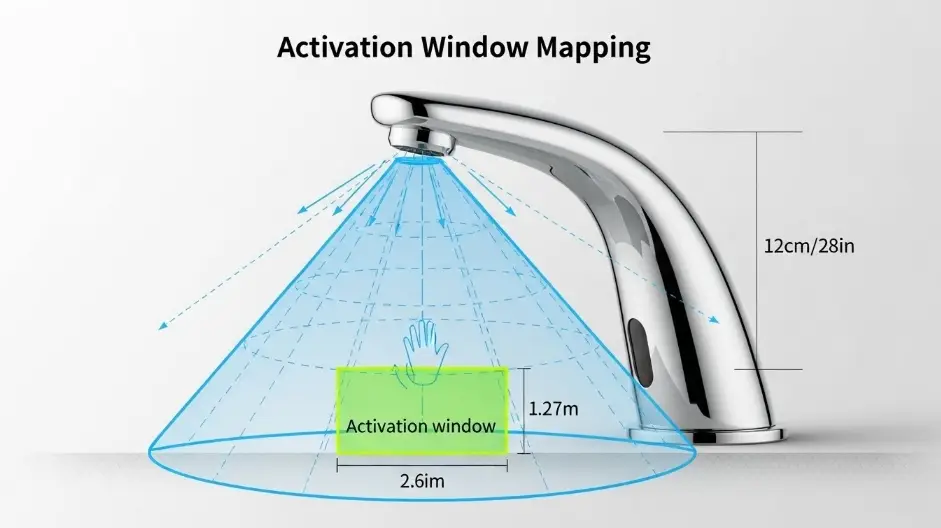 - Activation window must provide reliable detection within the intended hand wash zone for the specified basin and spout geometry.