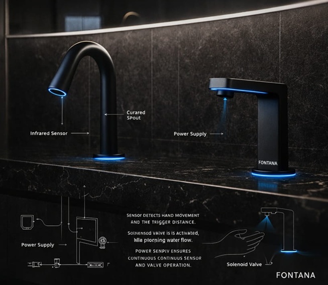 This diagram explains how commercial sensor faucets work by using infrared or ToF sensors to detect hand presence, allowing a controller to activate a solenoid valve and automatically regulate water flow in touchless systems