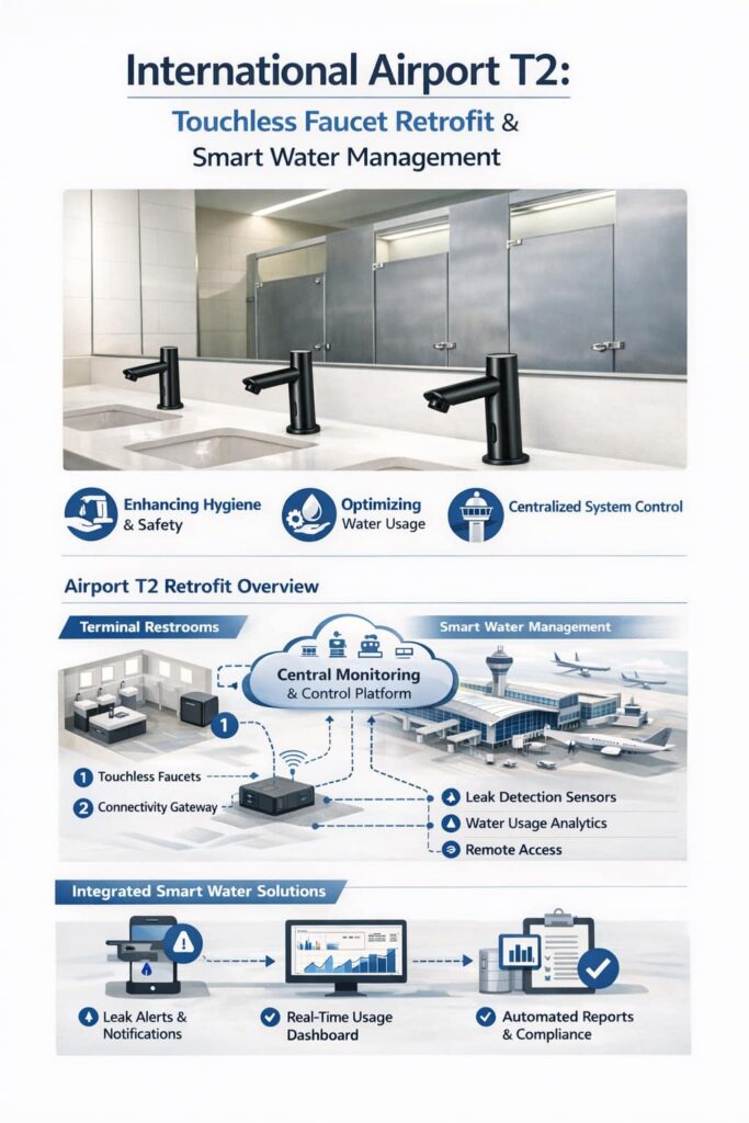 Campus-wide retrofit with touchless faucets and centralized policy management.