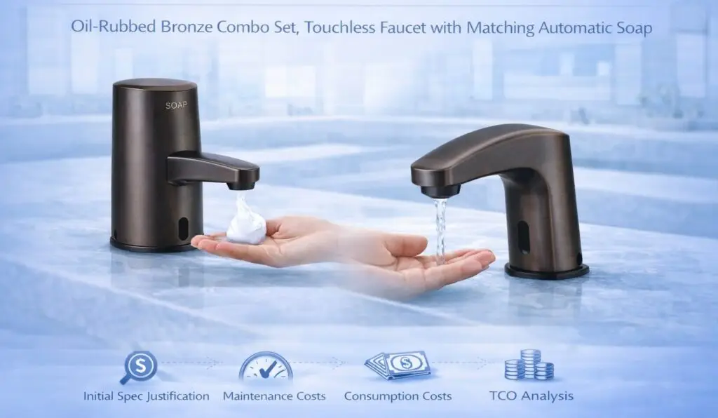 Oil‑rubbed bronze combo set; touchless faucet with matching automatic soap dispenser.