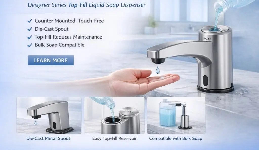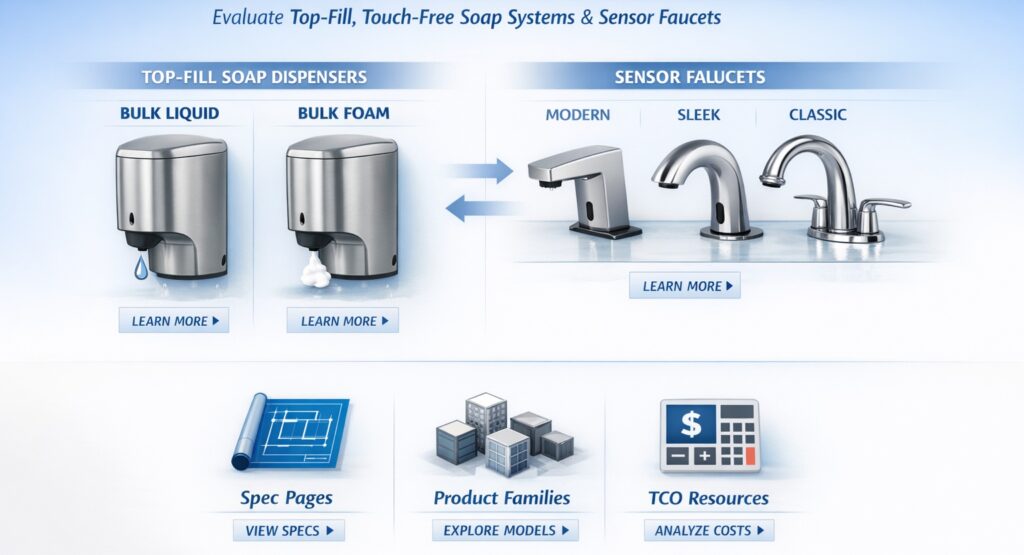 Quick picks for architects, designers, and facility teams evaluating top-fill, touch-free soap systems (bulk liquid & foam) and compatible sensor faucets. Links go to spec pages, families, and TCO resources.