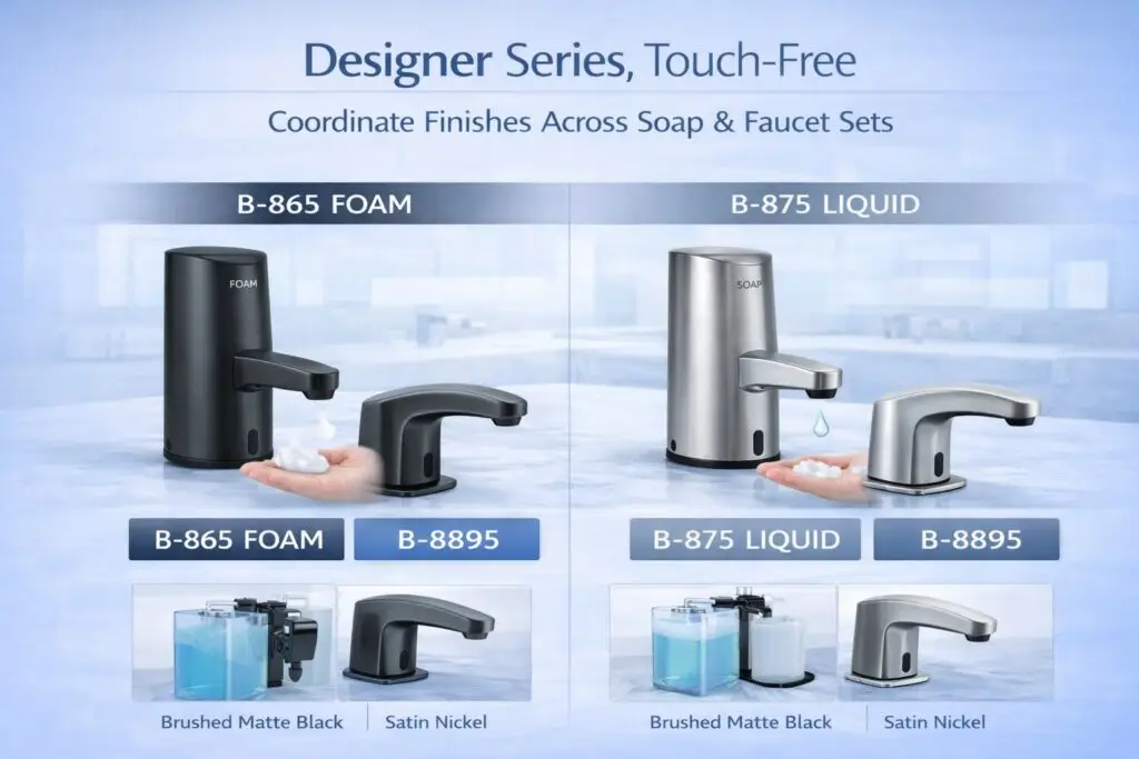 Tags: top‑fill • touch‑free • bulk‑soap compatible • liquid/foam options • designer finishes • TCO