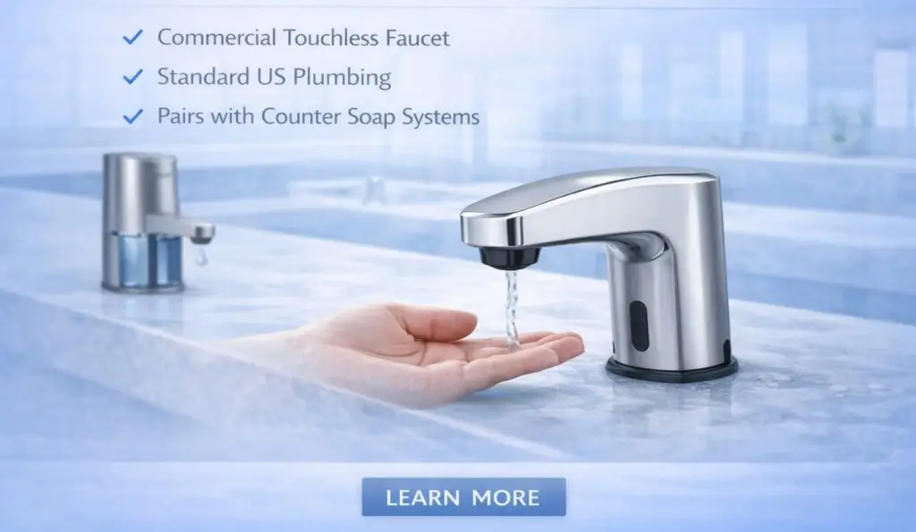 Commercial touchless faucet; standard US plumbing; pairs with counter soap systems.