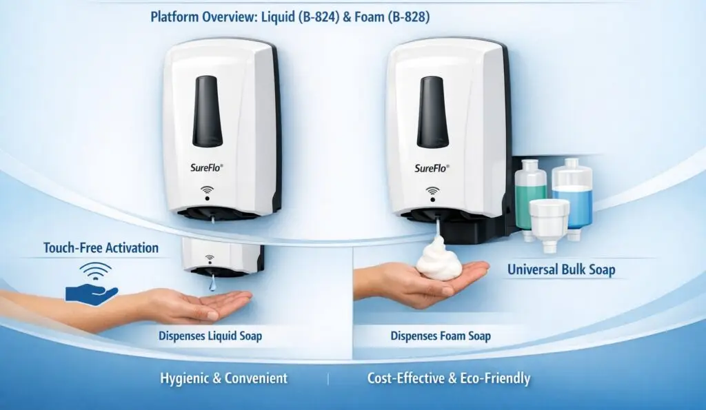 Platform overview; liquid (B‑824) & foam (B‑828). Touch‑free activation; universal bulk soap.