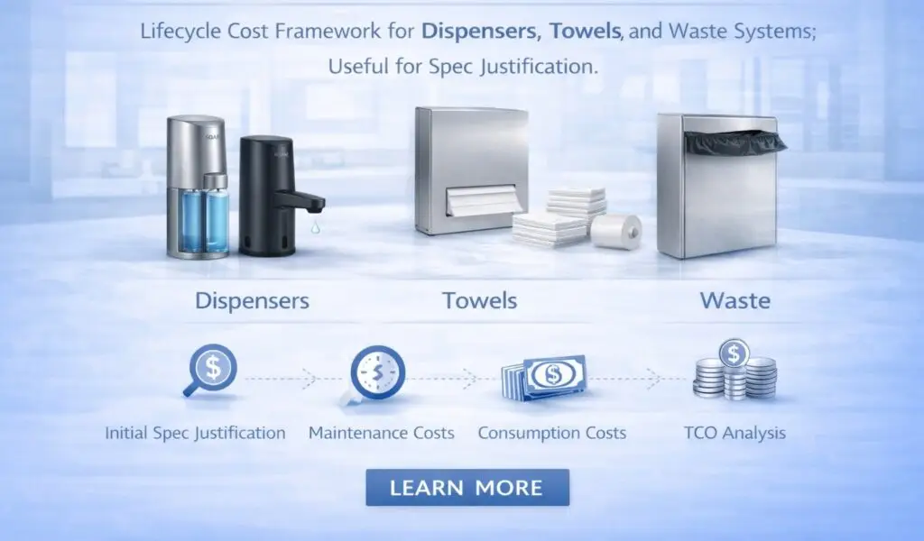 Lifecycle cost framework for dispensers, towels, and waste systems; useful for spec justification.