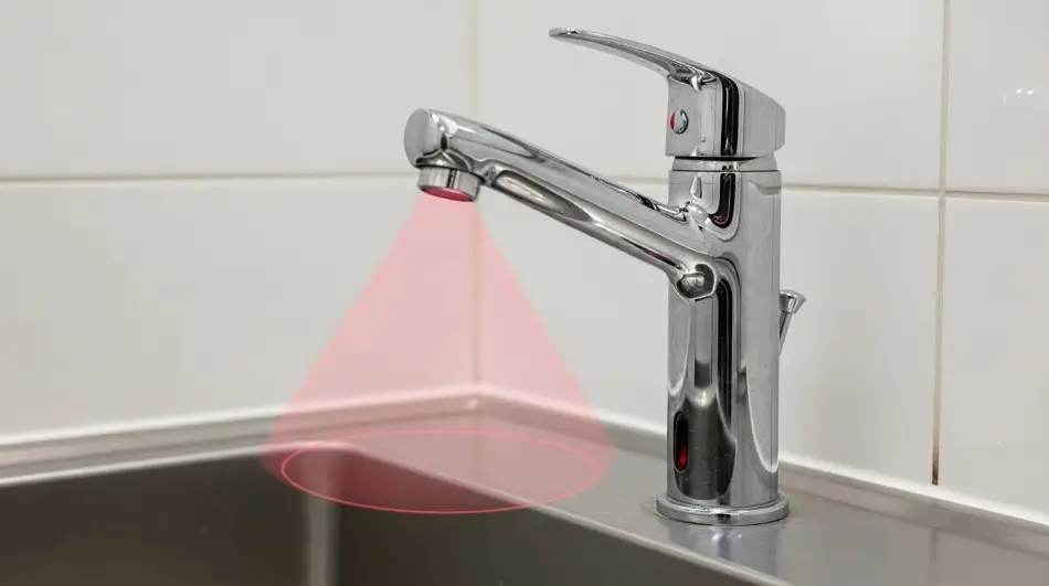 Most “IR sensor faucets” use an active reflective optical setup: an IR emitter sends light out, and a receiver measures the reflected signal when a hand enters the detection zone.
